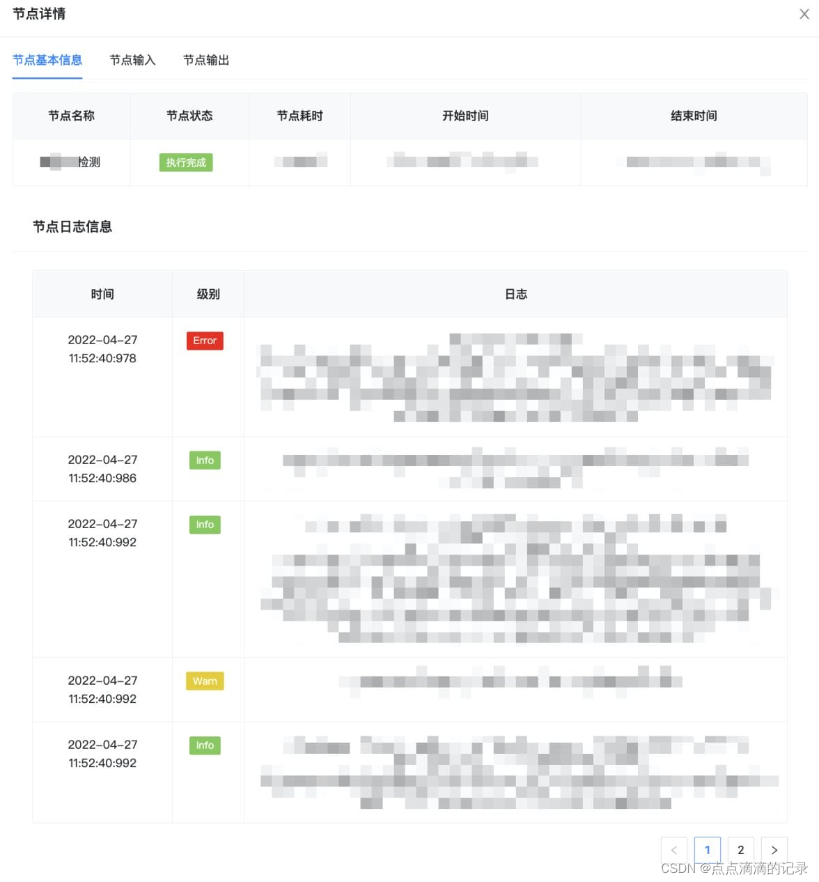 【节点详情查询功能】:支持展示任意已执行节点的详情,包括节点输入、输出,以及节点执行过程中的关键业务日志。