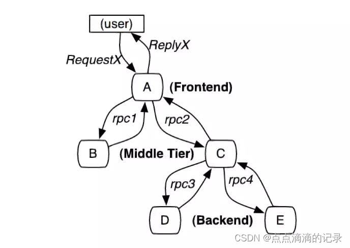 市面上的同类型框架几乎都是以Google Dapper论文为基础进行实现,整体大同小异,都是通过一个分布式全局唯一的id(即traceId),将分布在各个服务节点上的同一次请求串联起来,还原调用关系、追踪系统问题、分析调用数据、统计系统指标。分布式会话跟踪,是一种会话级别的追踪能力,如下图2所示,单个分布式请求被还原成一条调用链路,从客户端发起请求抵达系统的边界开始,记录请求流经的每一个服务,直到向客户端返回响应为止。