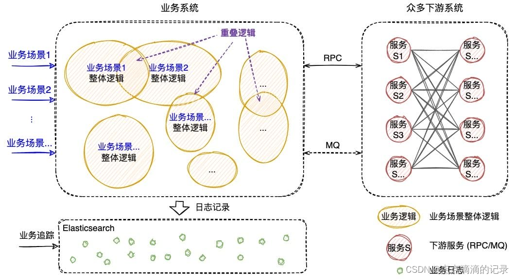 - 日志筛选困难:不同业务场景、业务逻辑之间存在重叠,重叠逻辑打印的业务日志可能相互干扰,难以从中筛选出正确的关联日志。