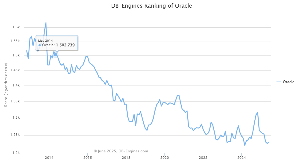 但是近些年受到开源和云计算技术发展的冲击,Oracle 数据库的市场份额在持续下降也是不争的事实,这一点从 DB-Engines 的得分趋势上也能明显看出来。但就是在这种背景下,Oracle 的股价硬是逆势创出了历史新高。今天我们就试着来聊聊这其中的原因。