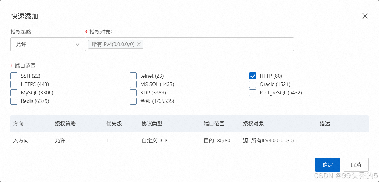 2.点击 云服务器ESC ->左边的安全组 ,点击第一个安全组ID,再点击快速添加 ->HTTP(80)这个打钩后按确定