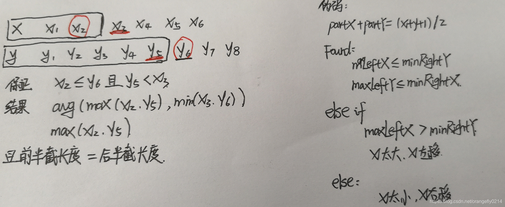 根据上图,两个数组我们分别以i,j为分割点,且左右两边相等,则很容易得到: