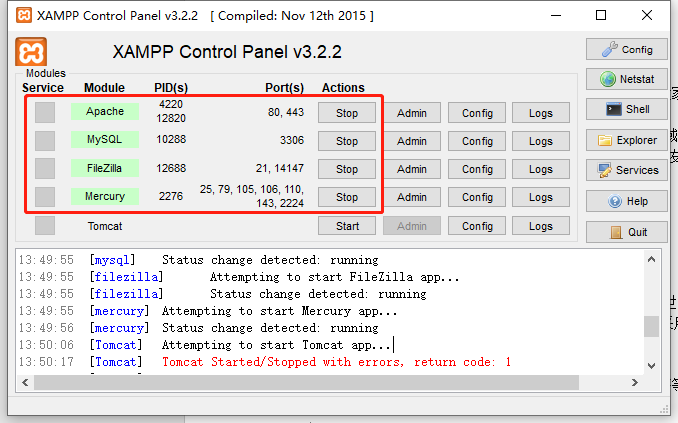 安装完xampp之后,记得打开这四项服务。