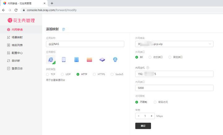 同样,先测试本地环境NAS可成功访问,然后同一网络环境下接入花生棒或花生壳盒子进行内网映射,在花生壳管理平台进行映射配置,正确填写NAS主机IP及端口号,生成NAS外网访问地址。