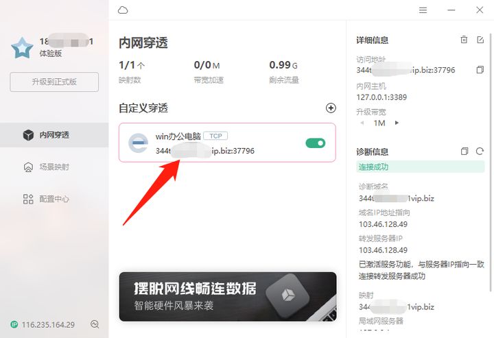 然后打开花生壳Win版客户端进行端口映射,值得一提的是,花生壳已经内置了“Windows远程桌面”映射模板,我们不需要再手动创建映射,直接选择这个模板后系统会自动生成远程桌面的访问地址。