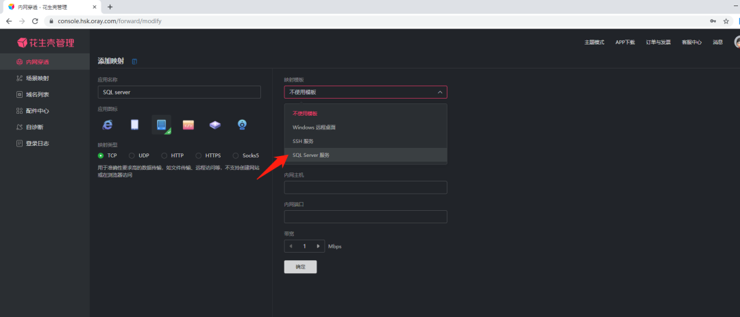 局域网环境下能正常访问SQL数据库后,将花生棒或花生壳盒子接通电源并接入到部署数据库服务器同一路由器下进行联网(花生壳盒子支持WiFi联网),再通过花生壳管理平台(花生壳PC管理或花生壳管理APP)激活花生壳盒子,并对数据库进行内网穿透配置,花生壳已内置SQI Server映射模板,直接选择并保存即可;