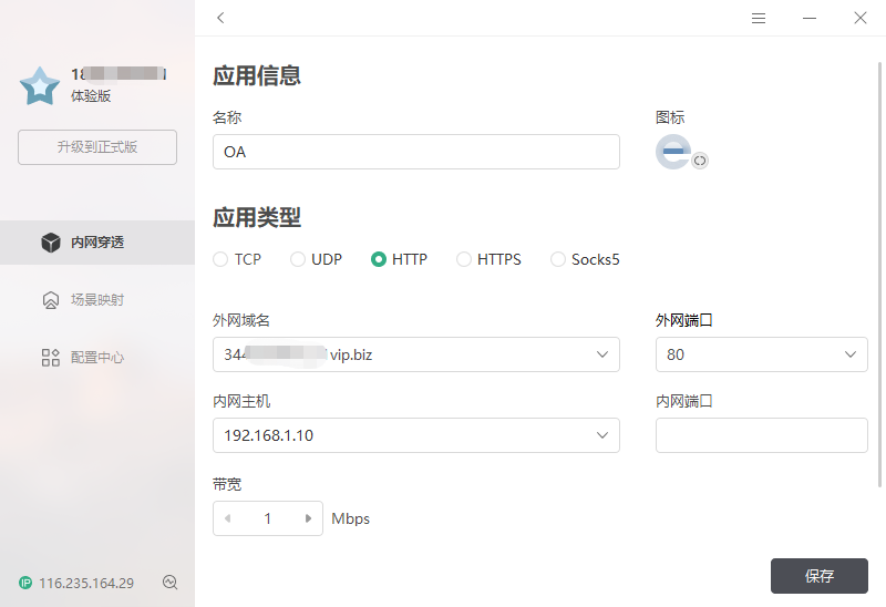 以通达OA为例,本地部署好并确保正常访问,然后用花生壳进行内网穿透,正确填写部署OA的服务器的IP及服务端口号,点击保存就生成了外网访问地址。