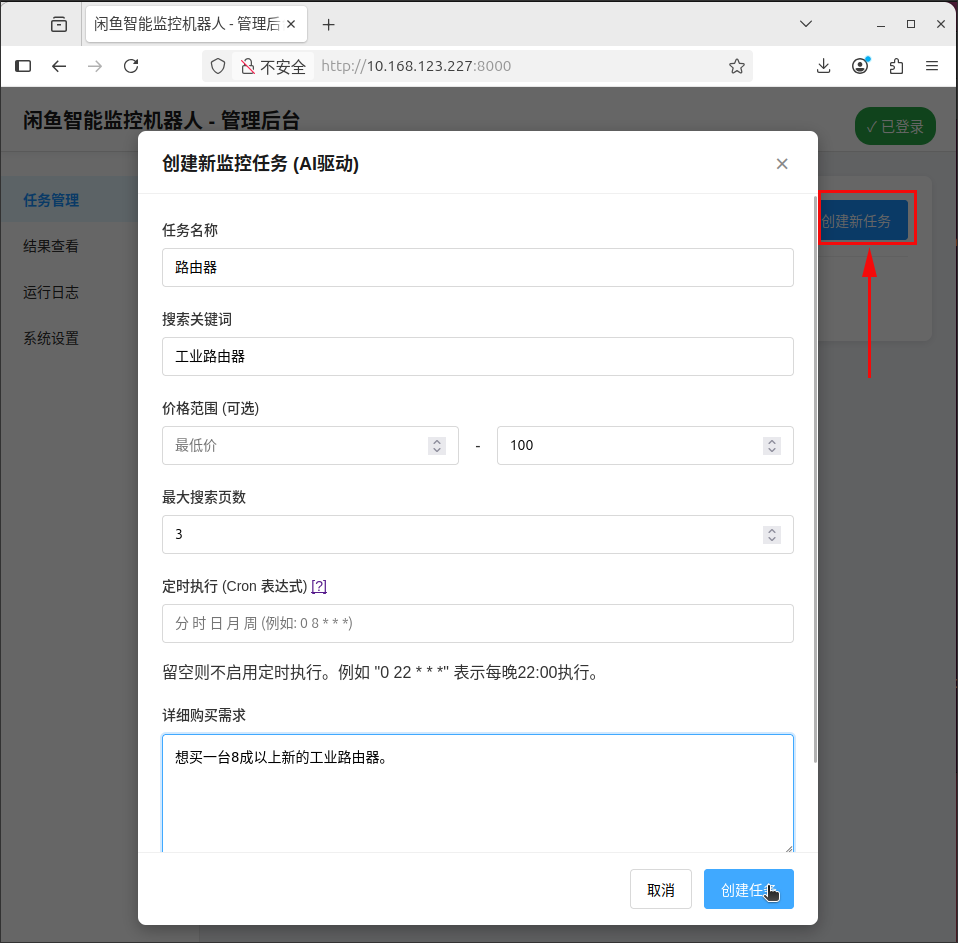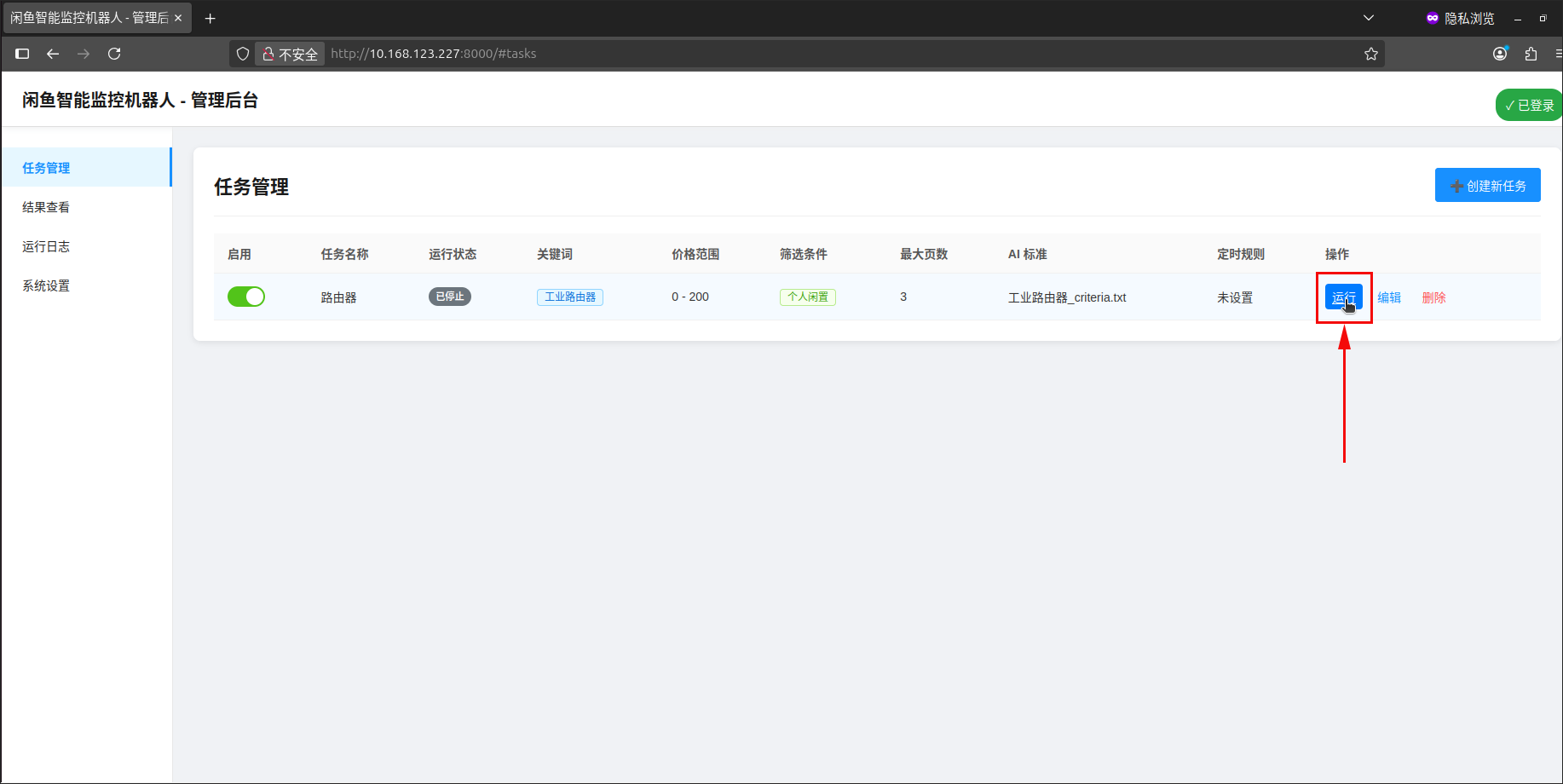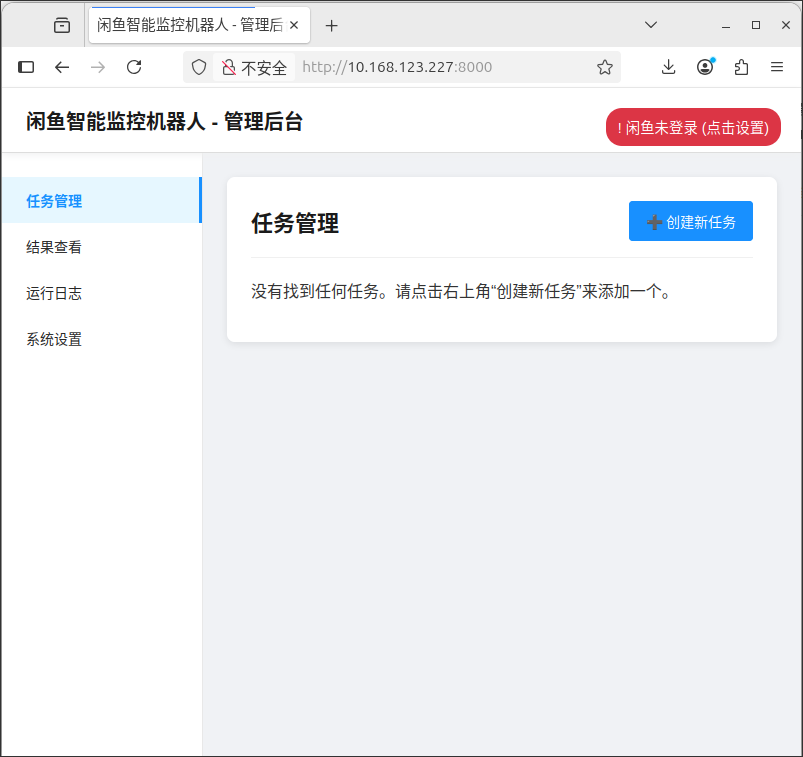 容器启动后,浏览器访问 http://<本机IP>:8000 即可进入后台。示例地址:http://10.168.123.227:8000。即可使用配置文档配置的web登录名及密码访问登录闲鱼智能监控机器人后台。