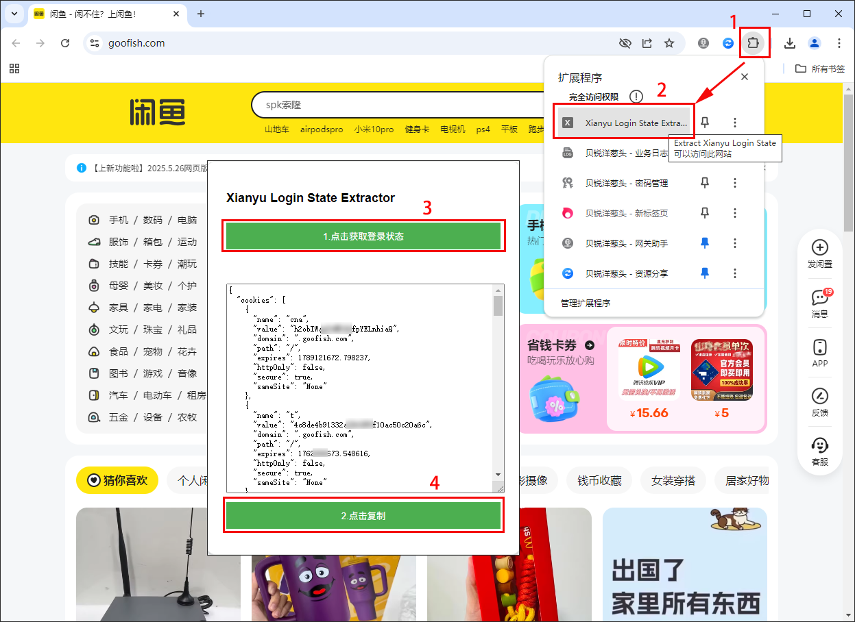 - 打开闲鱼网页版并登录,点击扩展图标 → “获取登录状态” → “复制”。