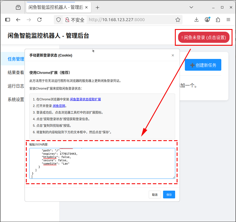 - 回到监控机器人后台,点击提示“闲鱼未登录”,粘贴刚才复制的状态码并保存。机器人即可模拟登录并抓取数据。