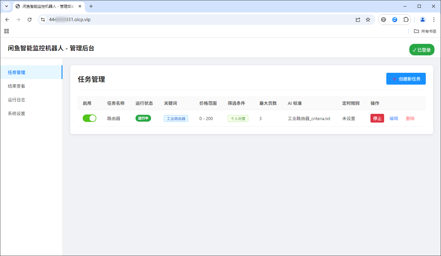 在任何可联网的设备浏览器中输入刚获得的外网地址,即可安全访问 Docker-闲鱼智能监控机器人后台。至此,整套系统已具备公网访问能力。