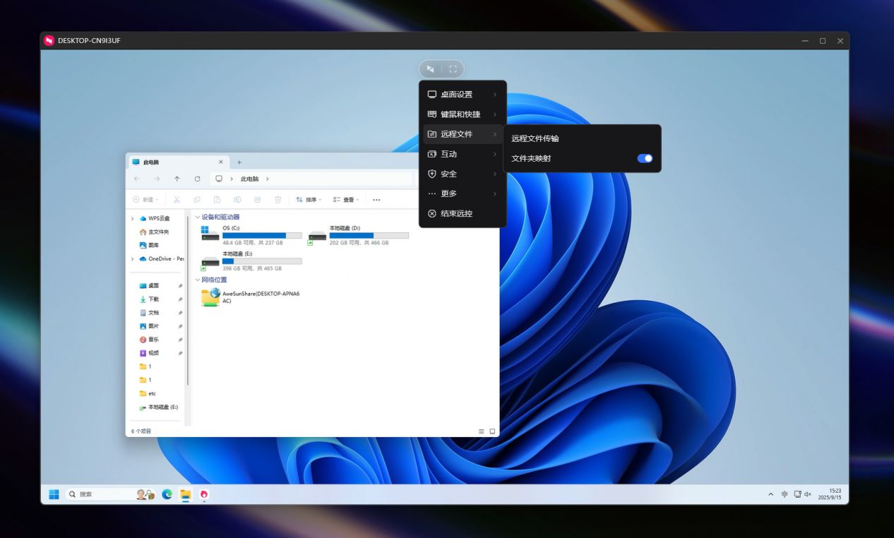 当然,如果我们已经在远程控制过程中,那么之前的文件拖拽等传输方式同样也便捷好用;如果涉及的文件资料复杂,我们暂时不确定资料库中哪些内容需要使用,也可以使用“文件夹映射”功能将整个资料库映射至被控端,方便我们按需取用。