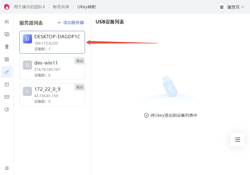 选择刚刚添加的USB服务器,点击“将Ukey添加到设备列表中”按钮,选择深思加密锁。将锁添加到控制台后,再将它们授权给具体成员。
