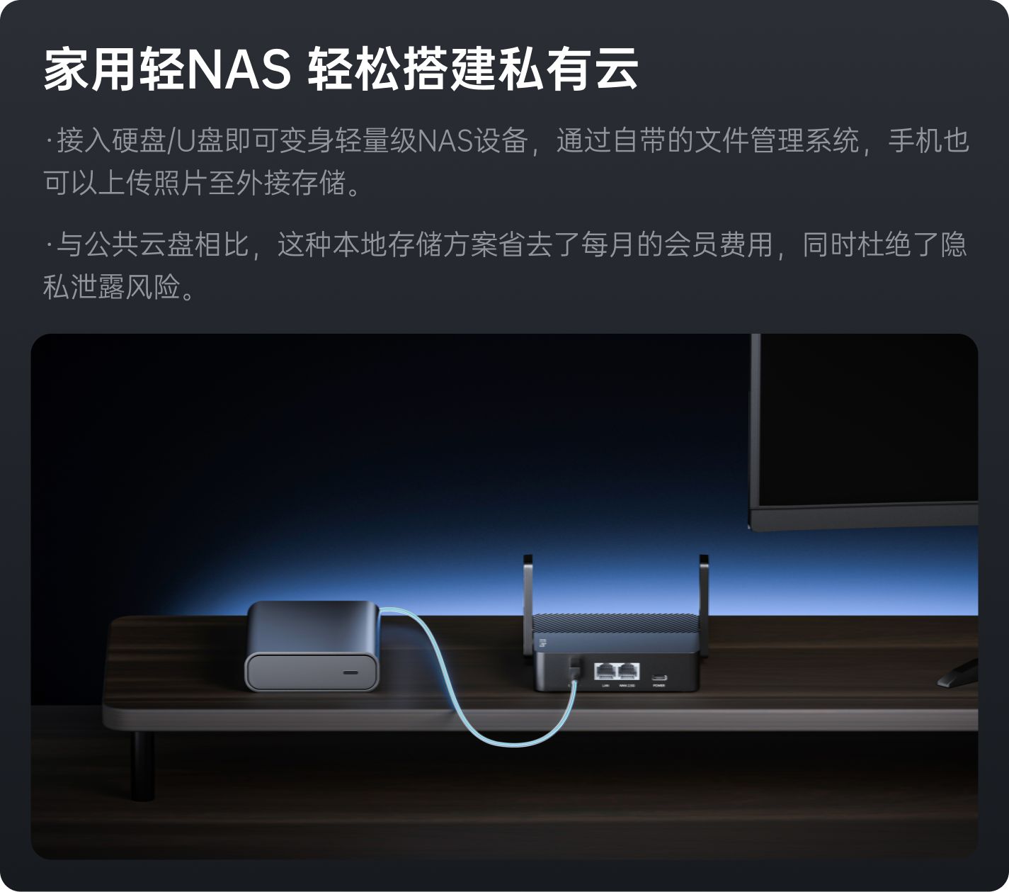 - 私有云盘:X1 Pro配备USB 3.0接口,可连接移动硬盘或U盘。结合异地组网功能,无需购买云服务器,即可快速搭建个人私有云,实现手机、平板、笔记本的远程访问与文件同步。