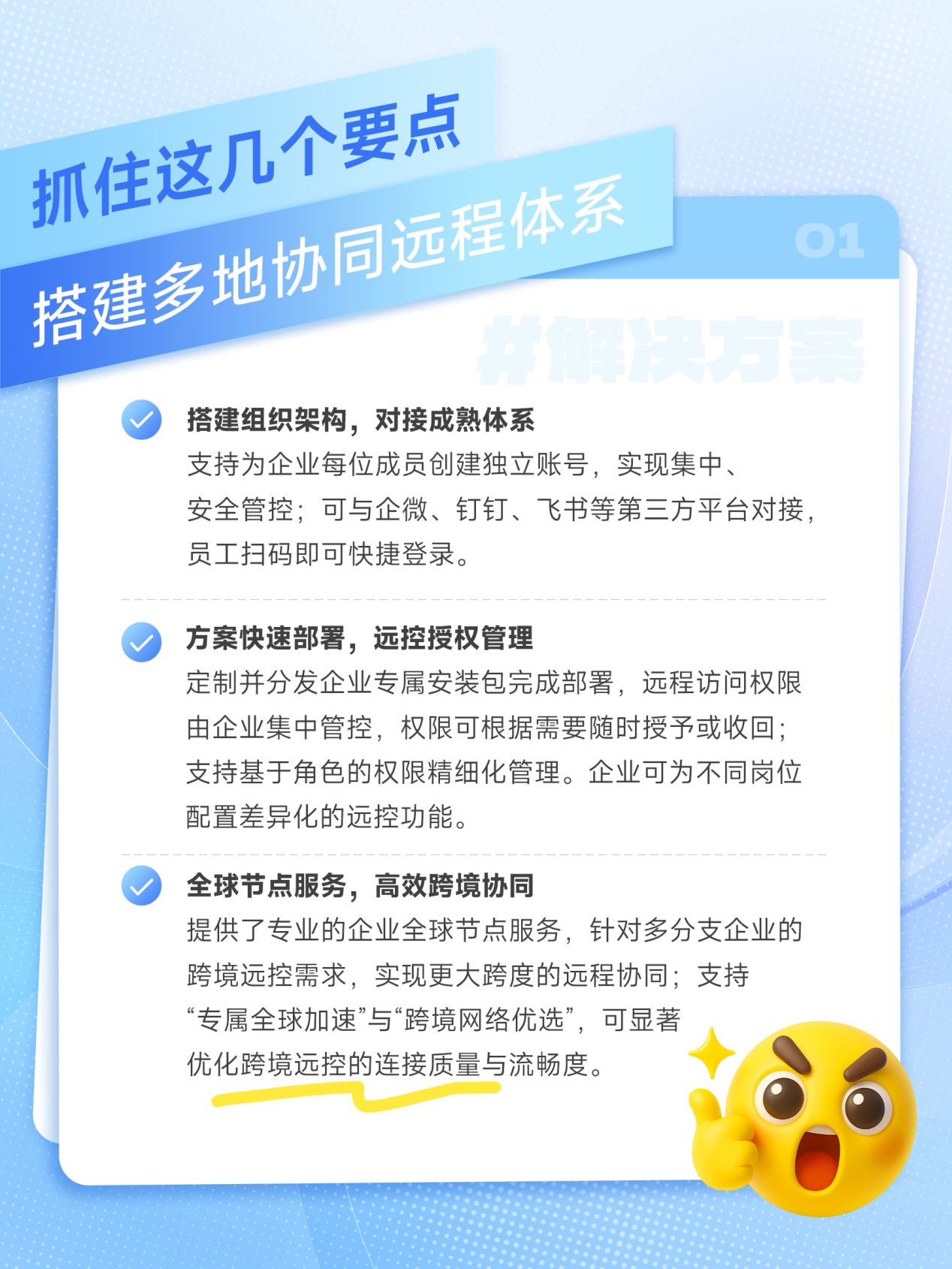 远程控制方案的引入能够很好地帮助企业搭建多地协同体系,但部署过程中也可能会面临组织架构重复构建、跨境远程控制性能不达标等具体痛点。