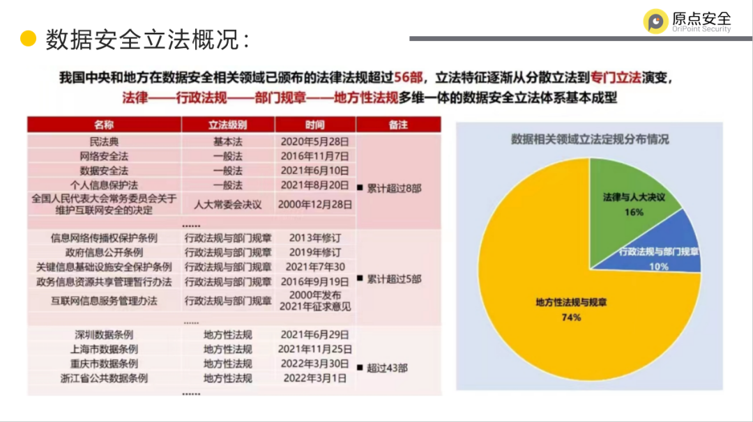 在此情况下,国家对数据安全更加重视。近五年,我国中央和地方在数据安全相关领域已颁布的法律法规超过56部,已形成法律-行政法规-部门规章-地方性法规多位一体的数据安全立法体系。