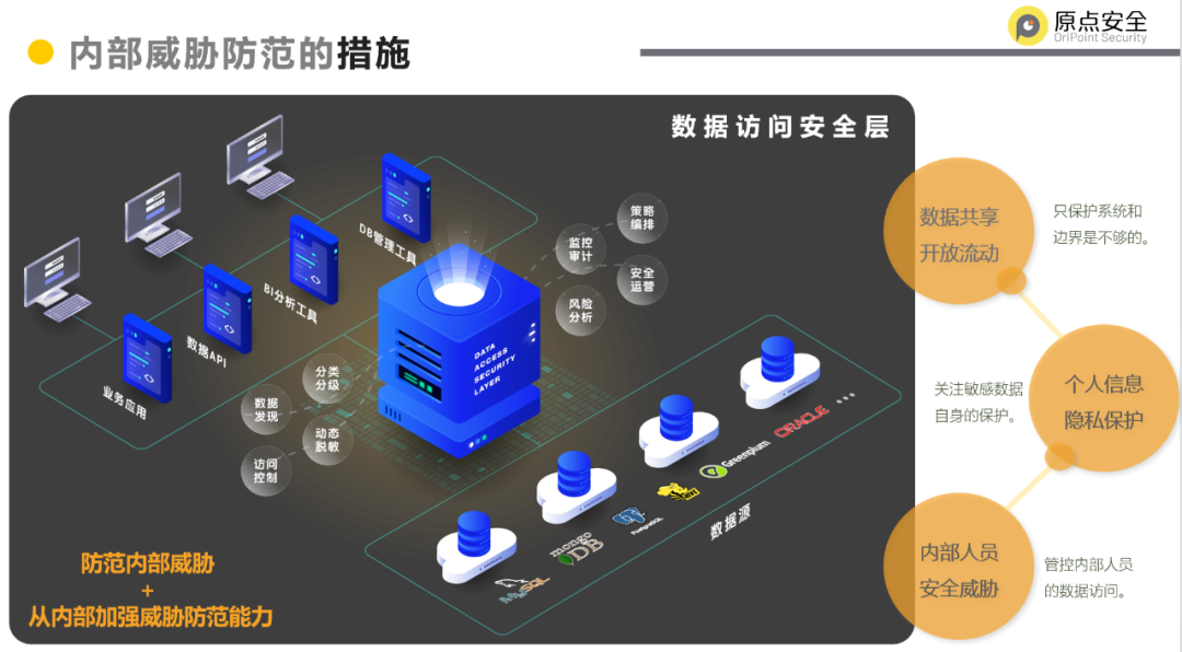 内部威胁防范有两层含义,一个是防范内部威胁,面向内部研发、运维、数据工程人员有意或无意的风险行为,第二个是通过构建“数据访问安全层”,从内部加强我们威胁防范的安全能力。