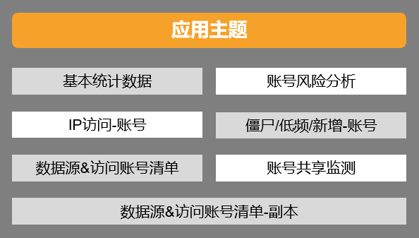 实时的账号风险分析、敏感数据的静态分布与使用状况、合规监督、高危/违规操作、疑似安全风险等主题分析模型,支持按需调整和定义。
