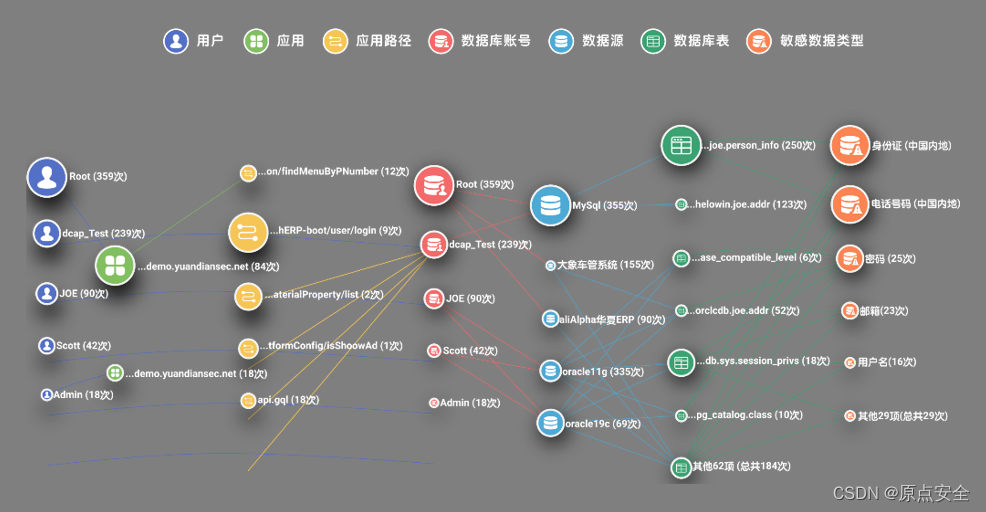 原点安全CDPP“数据访问轨迹”包含:用户、应用、应用路径、数据库账号、数据源、数据库表、敏感数据类型。