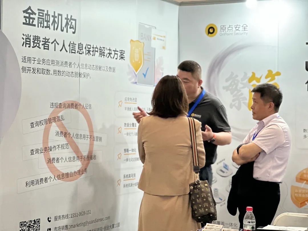原点安全在本次展会中设独立展台,并携「一体化数据安全平台 uDSP 金融机构消费者个人信息保护解决方案」首次亮相!原点解决方案适用于业务应用侧消费者个人信息动态脱敏以及数据侧开发和取数、用数的动态脱敏保护。展会现场与各金融行业专家同仁进行了充分、密切交流,原点解决方案得到了众多客户的认可。