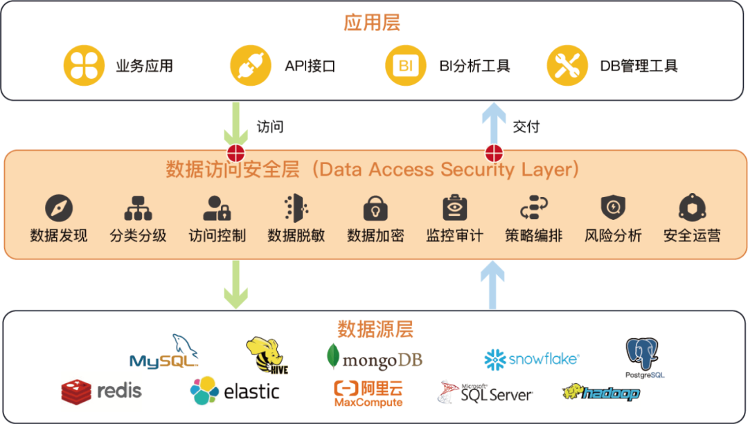 原点安全在访问数据的应用与数据源之间构建了数据访问安全层 DASL,用于实现数据源中敏感数据的访问控制和交付控制,可有效保护敏感数据免受未经授权的访问、篡改、泄露、破坏和过度暴露。有效提升消费者个人信息保护能力,合规更高效。