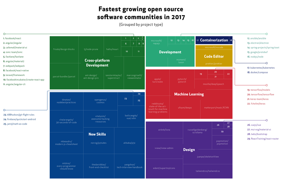 开发者一直致力于开发编码技能,2017 年 Star 的项目都与编码学习、获取编码工作和编码最佳实践的项目有关。例如,Chalarangelo/30-seconds-of-code 和 norvig / pytudes 分别在 javascript 和 python 中提供代码示例,以帮助您提高这些语言的流畅度。jwasham/coding-interview-university 和 yangshun/tech-interview-handbook 为如何通过软件工程师的面试提供了资源。i0natan/nodebestpractices,alibaba / p3c 和 thedaviddias/Front-End-Checklist 为编写代码和组织项目提供了最佳实践。