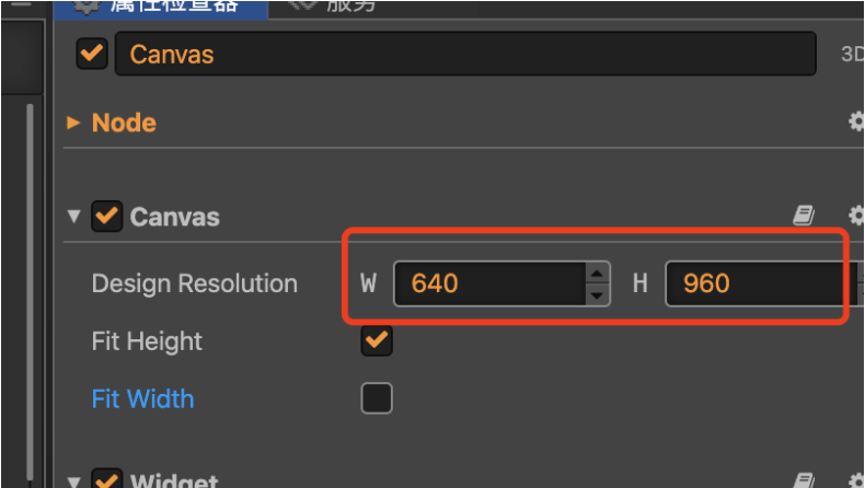 创建完毕后就可以在资源管理器的assets中看见刚才创建的名为game的scene。选择game场景,在左上角的层级管理器中可以看见场景的Canvas画布根节点,cocos默认画布是横屏的960*640,可以选择根节点然后再右侧属性检查器中调整宽高为640*960