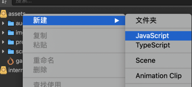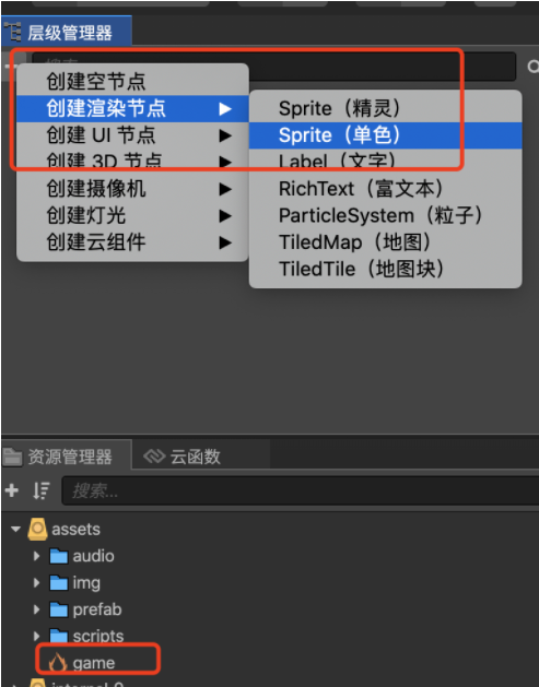 项目初始化之后,在左下角资源管理器新建一个游戏Scene,取名game作为游戏主场景。
