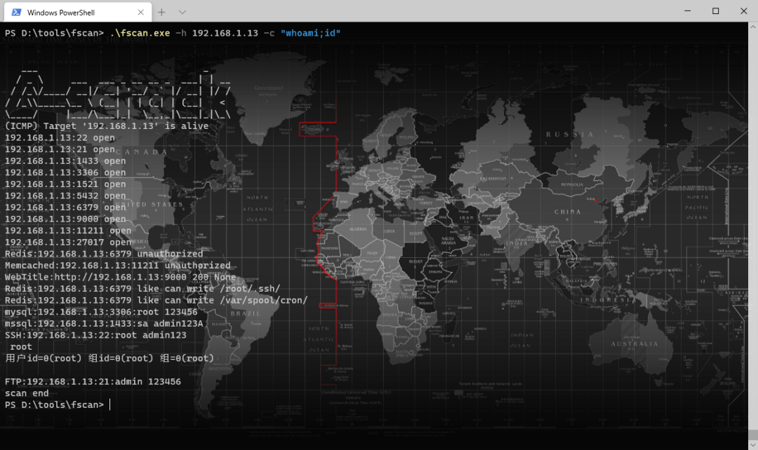 fscan.exe -h 192.168.1.1/24 -c whoami (ssh 爆破成功后,命令执行)