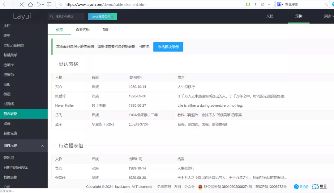 比如,一个静态表格,基本上在不修改的现有代码的情况下,只要增加 class="layui-table",就能立刻展现出优美的界面。