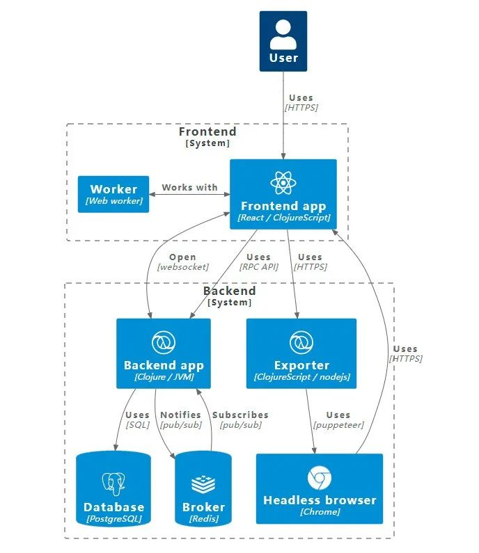 Penpot 具有典型 SPA 的架构。有一个前端应用程序,用 ClojureScript 编写并使用 React 框架,与后端服务通信,该服务将数据保存在 PosgreSQL 数据库中。