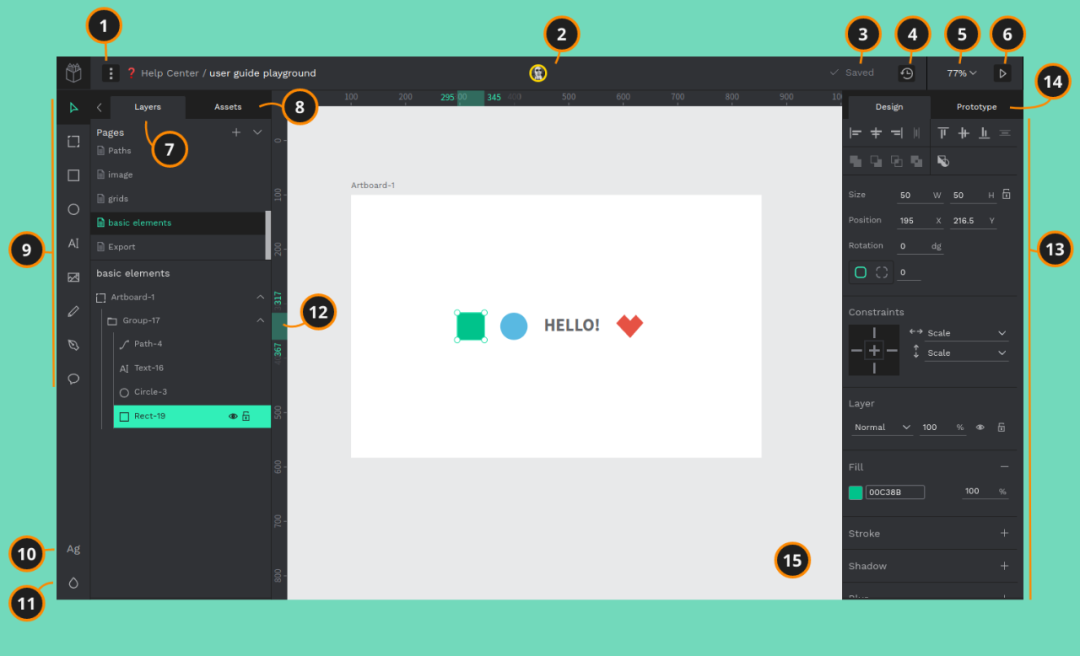 工作空间是实际创建设计的地方,有一个无限的画布,可以在其中直接工作,同时也可以在画板中创建和工作。工作空间包含 15 个功能,主菜单、用户、文件状态、历史面板、缩放、视图模式、图层面板、资产面板、工具栏、排版调色板、调色板、规则、设计属性、原型模式、视图。