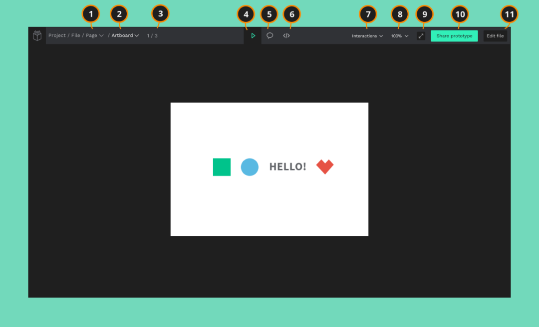 视图模式可以展示和分享在工作空间的设计结果,还有一个代码模式,可以在其中获取对象规范和代码片段,包含 11 个功能,页面选择器、画板选择器、画板计数器、播放模式、评论模式、代码模式、交互设置、缩放选项、全屏、共享原型选项、文件编辑。