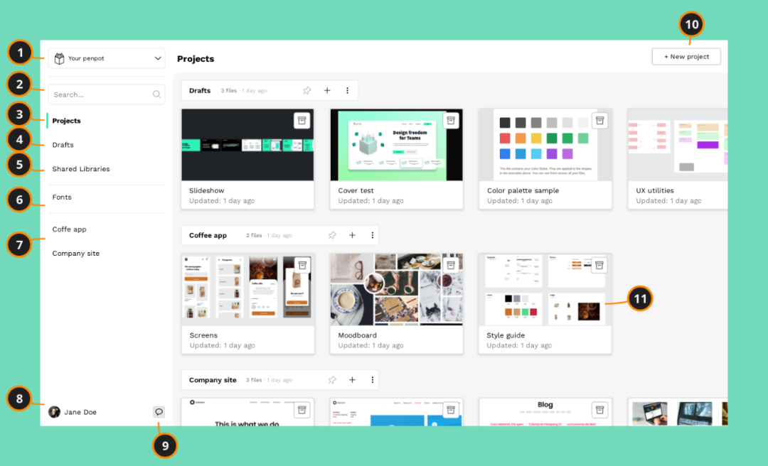仪表板是组织文件、库、项目和团队的地方,包括 11 个功能,团队、搜索文件、项目 、草稿、共享库、自定义字体、固定项目、用户区、评论通知、创建项目、文件卡。
