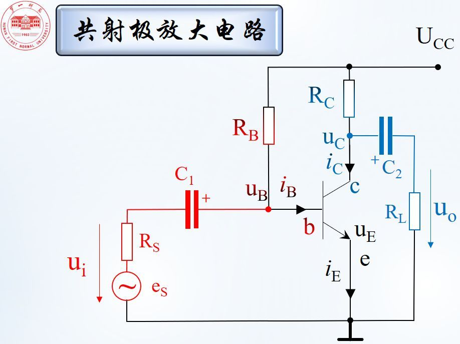 如果电阻大小合适,这个放大电路能够将小信号ui放大成相位相反的大信号uCE,如下方动画所示: