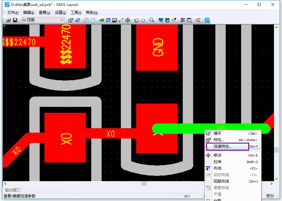 5、我们任选一段从焊盘引出的导线,【鼠标右键】–【泪滴特性】,如图5