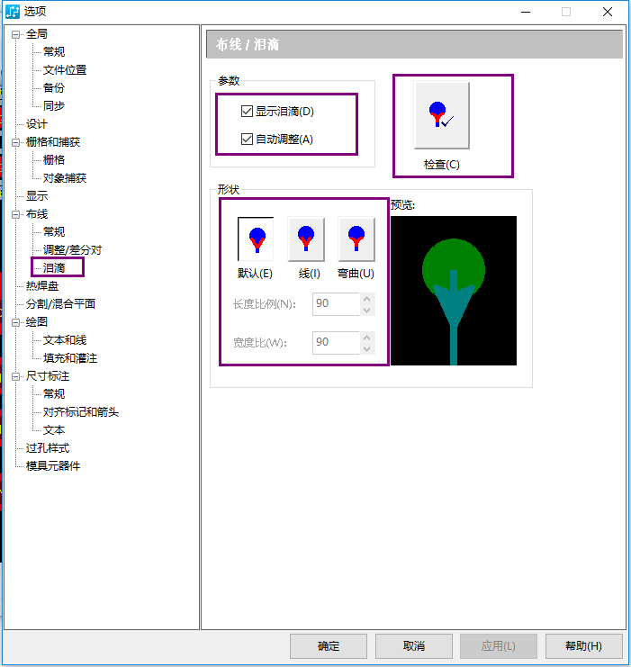 2、在【布线】–【泪滴】设置泪滴形状及参数,如图2