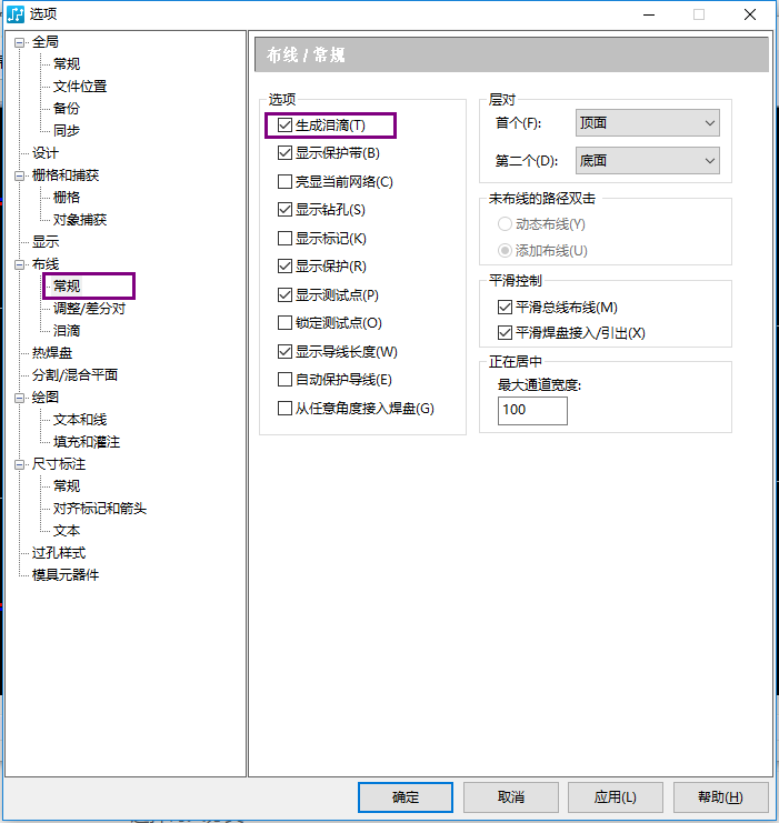1、使用【alt+enter】快捷键弹出对话框。在【布线】–【常规】–【选项】–【生成泪滴】打勾,如图1