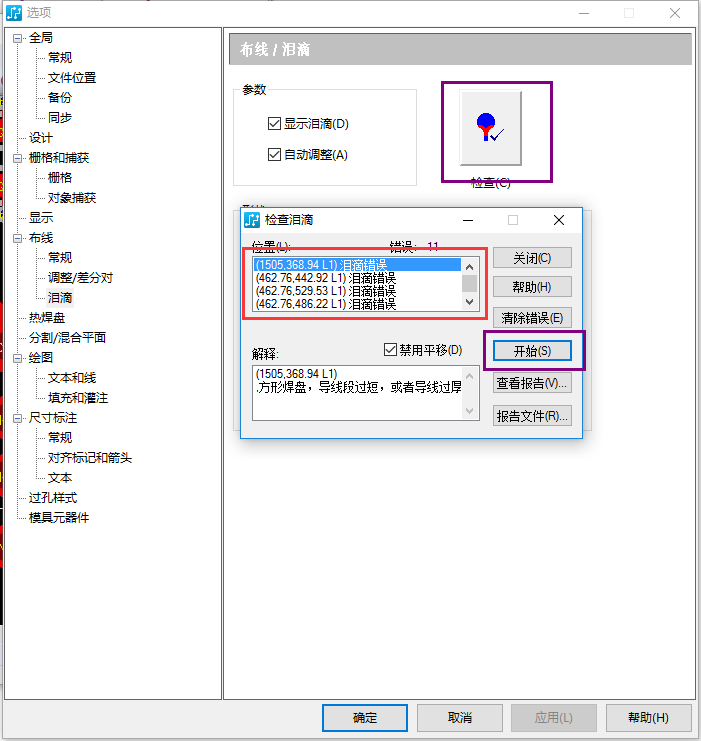 3、点击图2中【检查】,弹出的对话框点击【开始】,系统会自动检查筛选添加泪滴出错的位置及原因,可以通过提示来排除错误或者忽略。如图3
