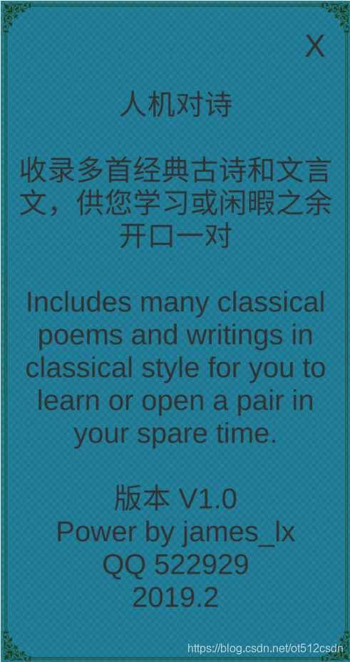 2019年2月,使用UNITY2D开发的安卓版应用程序,“人机对诗APP” 完成了。