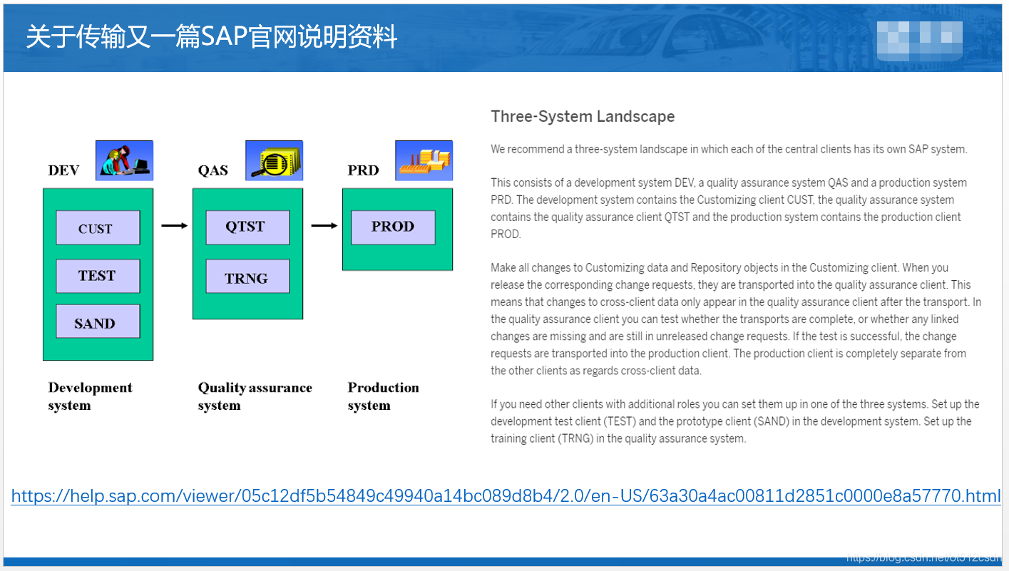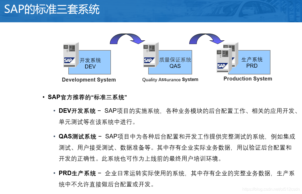 本文详细介绍了SAP推荐的标准三系统模型,包括用于开发的DEV系统、用于测试的QAS系统以及实际运行的PRD生产系统。DEV系统负责业务模块配置与开发;QAS系统进行集成测试和用户接受测试;PRD系统则承载企业日常业务。