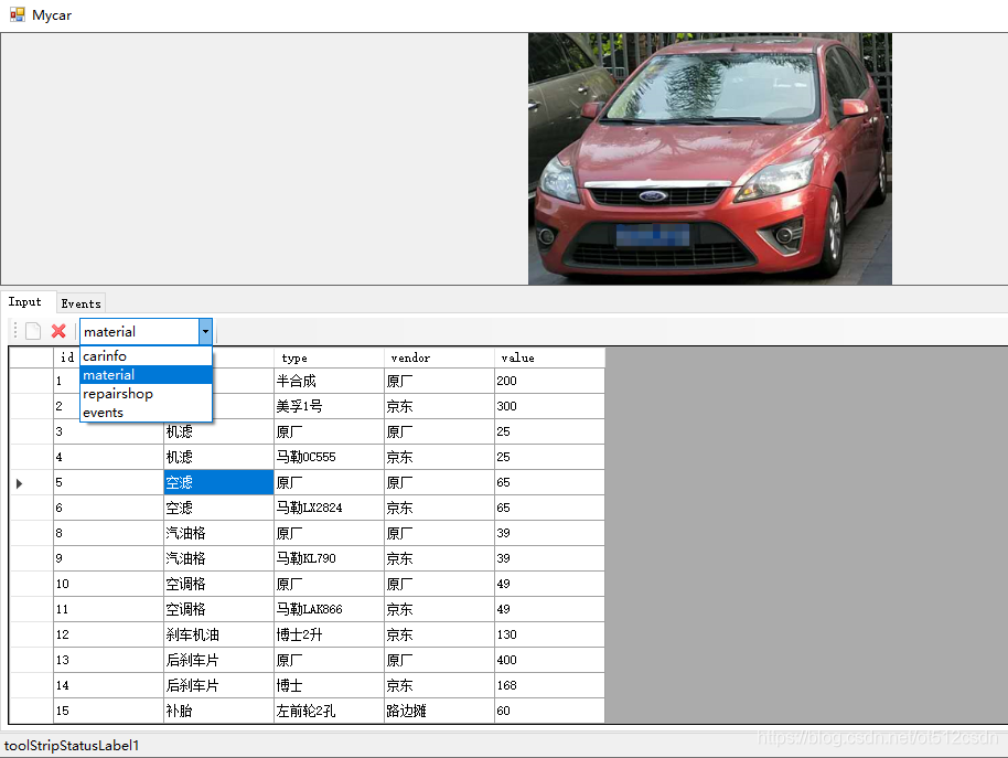 今天继续做了一点汽车保养记录工具,发现只需要4张表,供应商字段放物料表中就可以了。