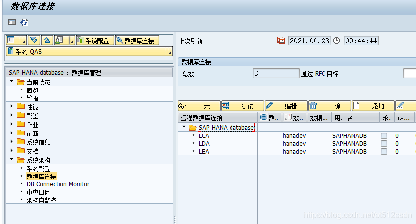 在ECC版本中,APO的LiveCache有一个单独的数据库,SAP 中使用数据库链接LCA、LDA、LEA链接到这个数据库。