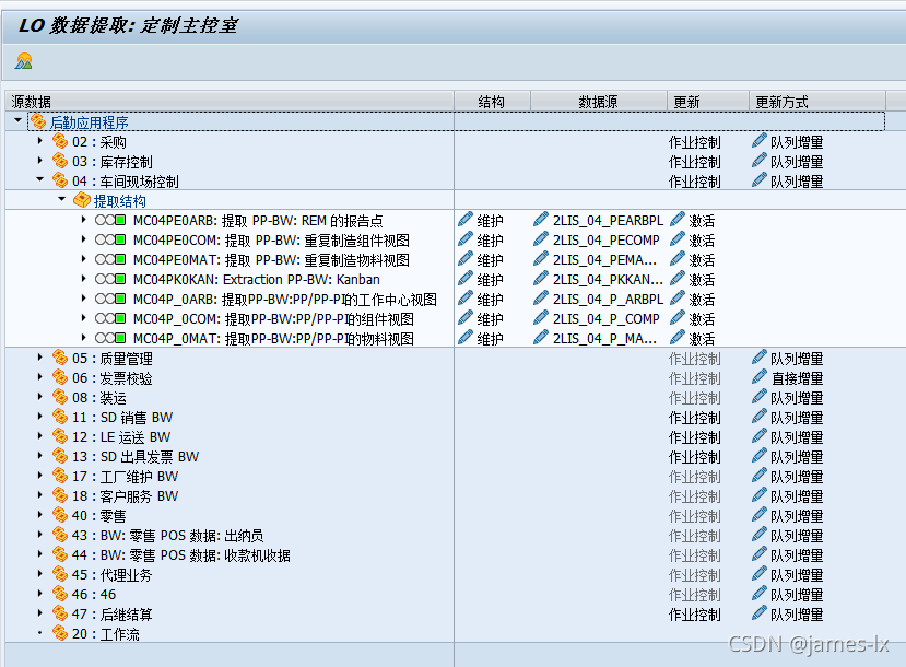 百度了一下,发现MCEX02 MCEX03 MCEX04 队列是S4与BW的数据同步。就是说,这些数据是给BW用的。还可以在LBWE中看到具体的接口配置: