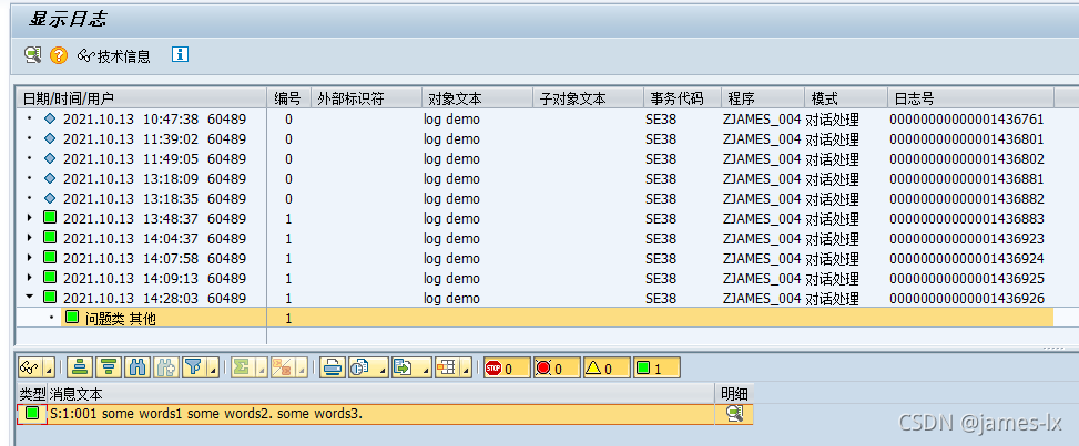 4、最后,在SLG1中看看我们保存的log头和log内容: