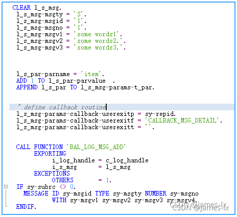 本文介绍了如何使用BAL_LOG_API进行日志操作,包括使用BAL_LOG_CREATE创建日志头,通过BAL_DB_SAVE将日志保存到数据库并获取logid,以及利用BAL_LOG_MSG_ADD添加消息内容。同时,文中提及了回调参数params-callback-userexitp、params-callback-userexitf和params-callback-userexitt的用途,它们可能与错误跟踪相关。最后,可以在SLG1中查看保存的log头和内容。