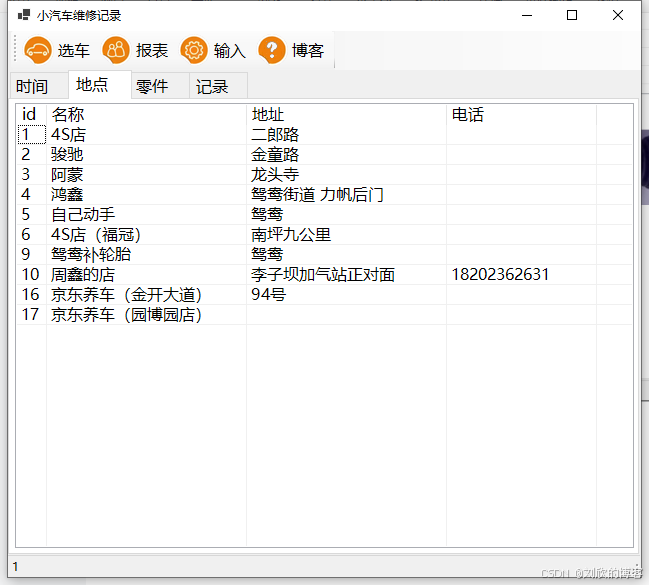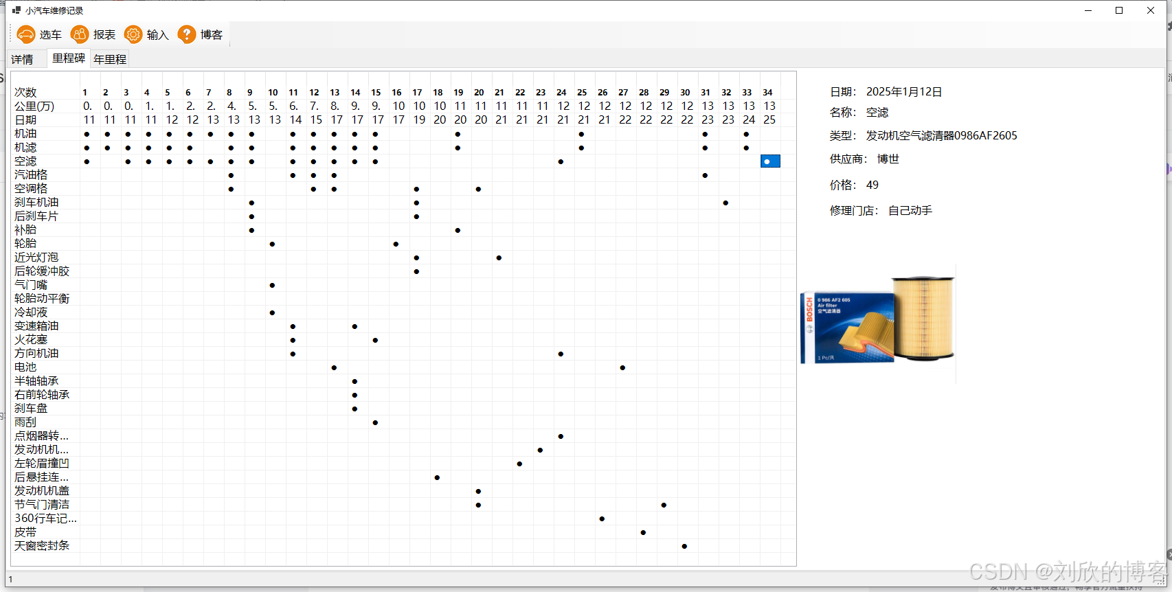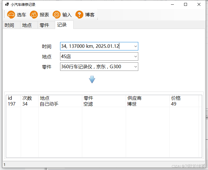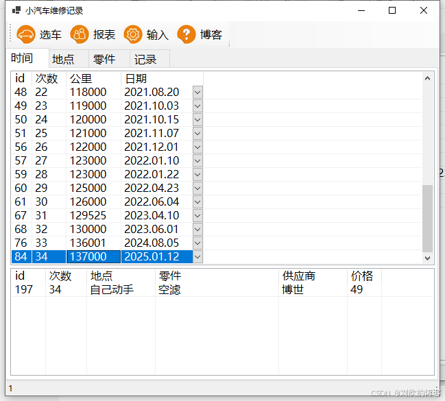所以博主写了这个电脑上运行的程序:小汽车维修记录。博主是个懒人,把程序设计成维修数据是一次输入的,后面可以一直使用。比如汽车保养零件,它包括复杂的图片、型号、供应商、价格等等,你只需要一次输入,下次同样的零件记录,直接从零件库中选中即可。