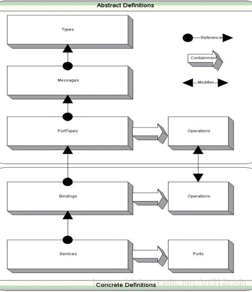 下面的图中,箭头连接符代表文档不同栏之间的关系。点和箭头代表了引用或使用关系。双箭头代表"修改"关系。3-D的箭头代表了包含关系。这样,各Messages栏使用Types栏的定义,PortTypes栏使用Messages栏的定义;Bindings栏引用了PortTypes栏,Services栏引用Bindings栏,PortTypes和Bindings栏包含了operation元素,而Services栏包含了port元素。PortTypes栏里的operation元素由Bindings栏里的operation元素进一步修改或描述。