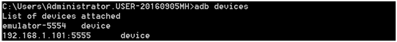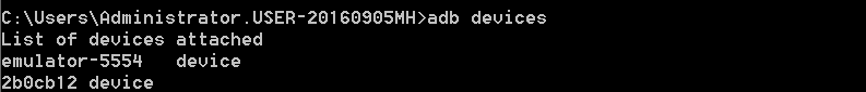 如上图连接了2台设备,其中emulator-5554、2b0cb12为设备的SN序列号,后面的device表示连接状态为已连接。